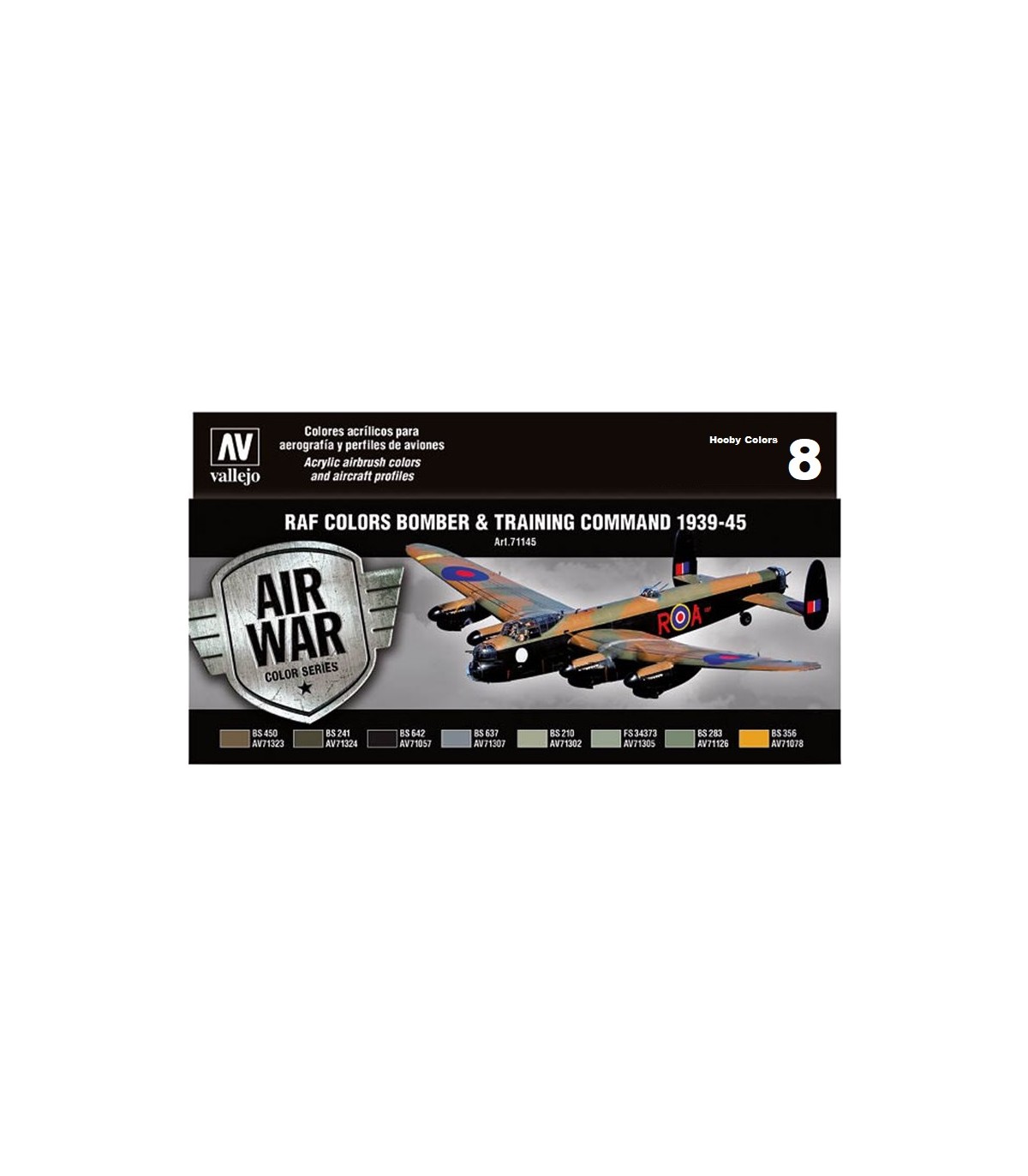 Set de 8 colors Model Air de 17 ml desenvolupat per pintar tots els bombarders (lleugers, mitjans i pesats) de l'Bomber Air Command de la RAF des de 1939 fins a finals de la guerra. Inclou el color "Trainer Yellow", que combinat amb la resta de tons o tot sol ens permetrà decorar la majoria d'aparells d'entrenament, enllaç i fins i tot prototips.