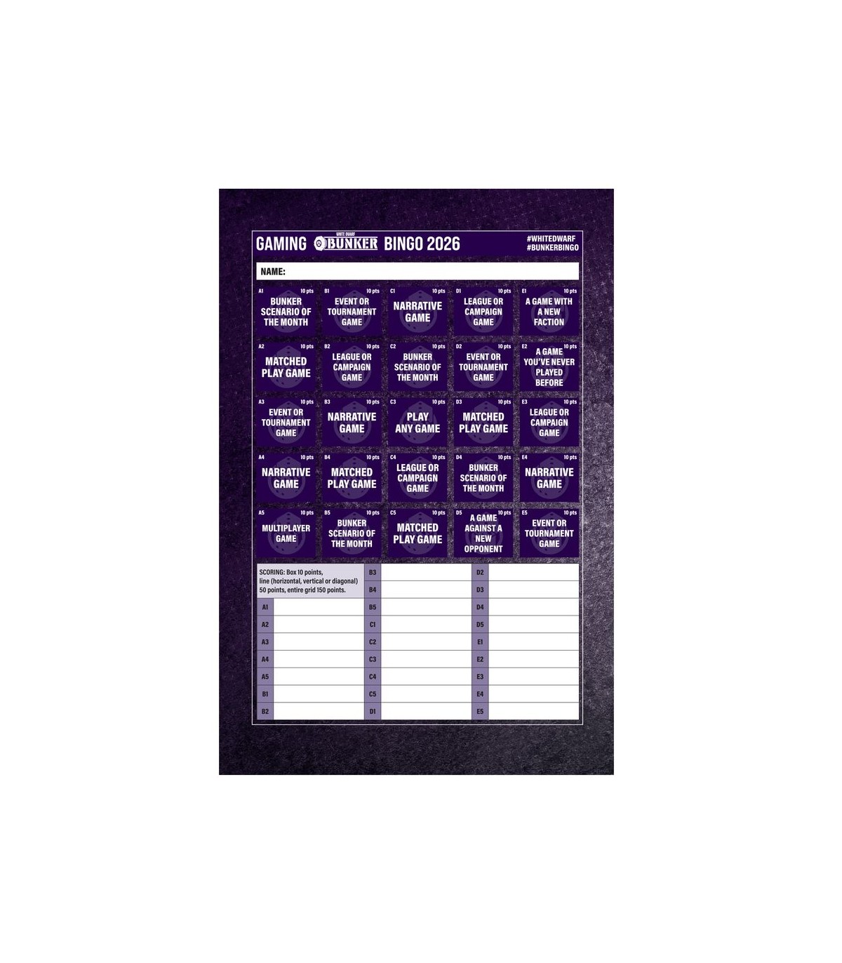 Each copy of White Dwarf 519 also comes with a double-sided card featuring the Warhammer 40,000 and Warhammer Age of Sigmar Scenarios of the Month. This issue also includes a 2026 Bunker Bingo card to track your hobby progress over 2026.