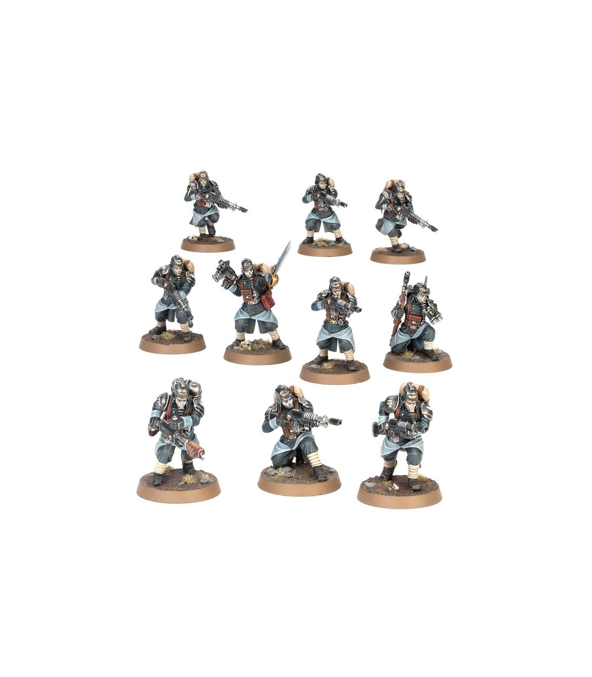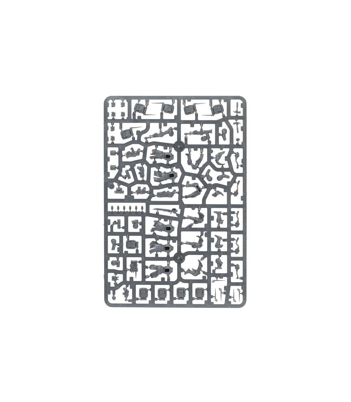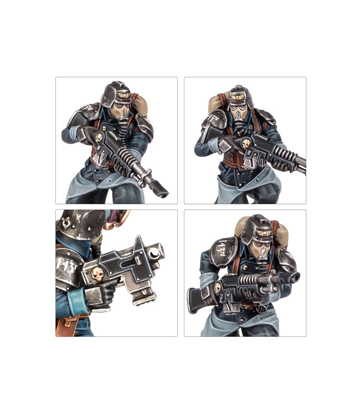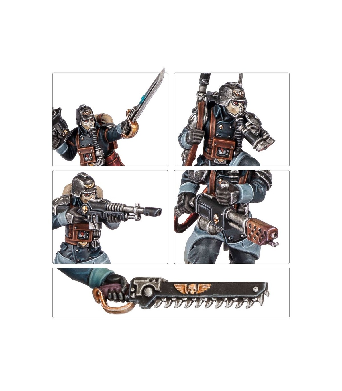 Este kit extremadamente versátil ofrece muchas opciones para personalizar tu unidad. Puedes montar una miniatura como Vigía, armado con una pistola de plasma, pistola láser o pistola bólter, y con una espada sierra o arma de energía en la otra mano. Para el resto de miniaturas puedes usar un rifle láser telescópico para un francotirador, otra puede llevar un lanzallamas, otra un lanzagranadas y otra un rifle de plasma o un rifle de fusión. El vocooperador puede montarse con binoculares o una granada en su mano izquierda, y una de las miniaturas puede llevar un botiquín. También hay un montón de accesorios estéticos para decorar aún más tus miniaturas, como bayonetas, picos, bolsas de cinturón, granadas y más.