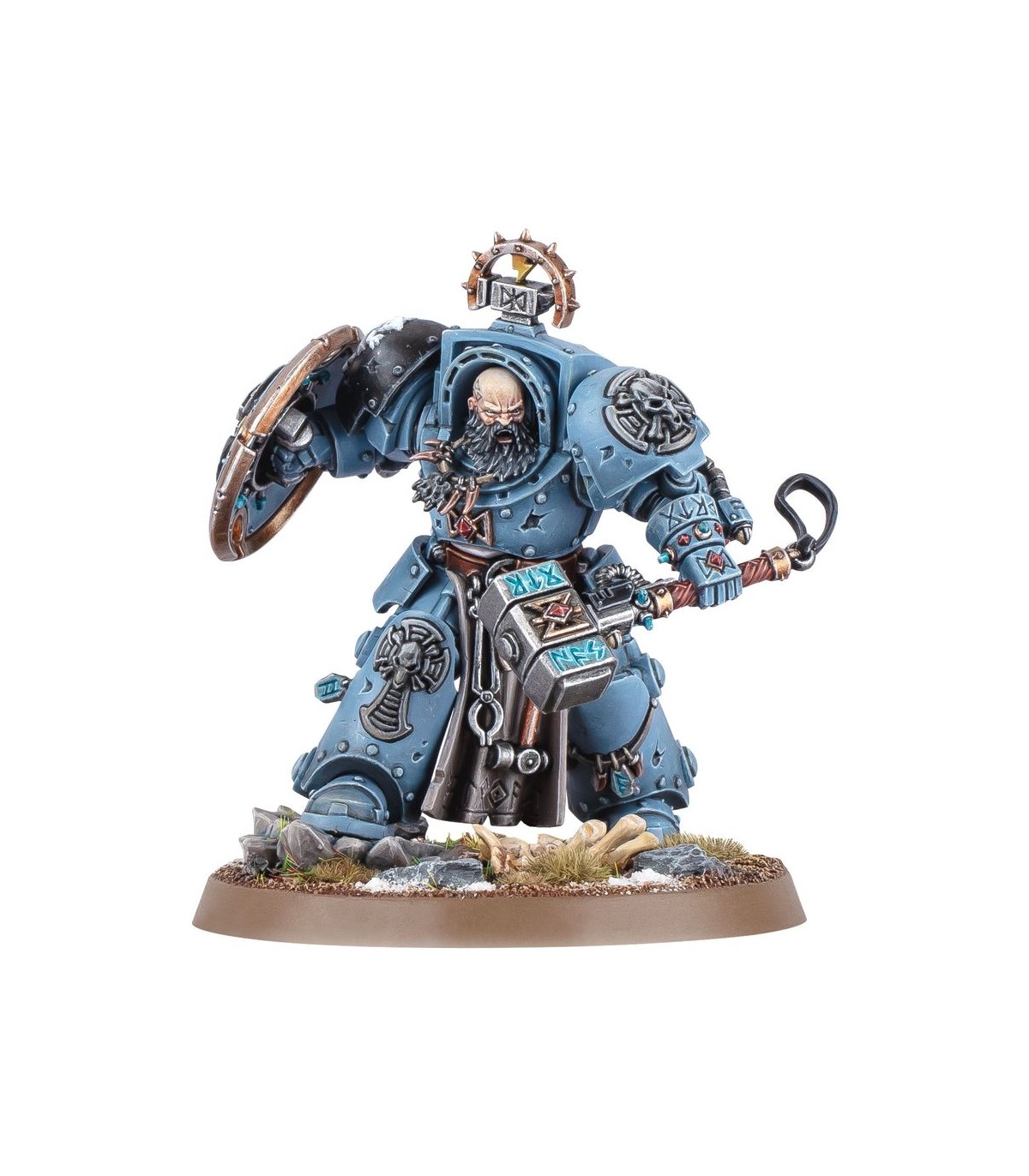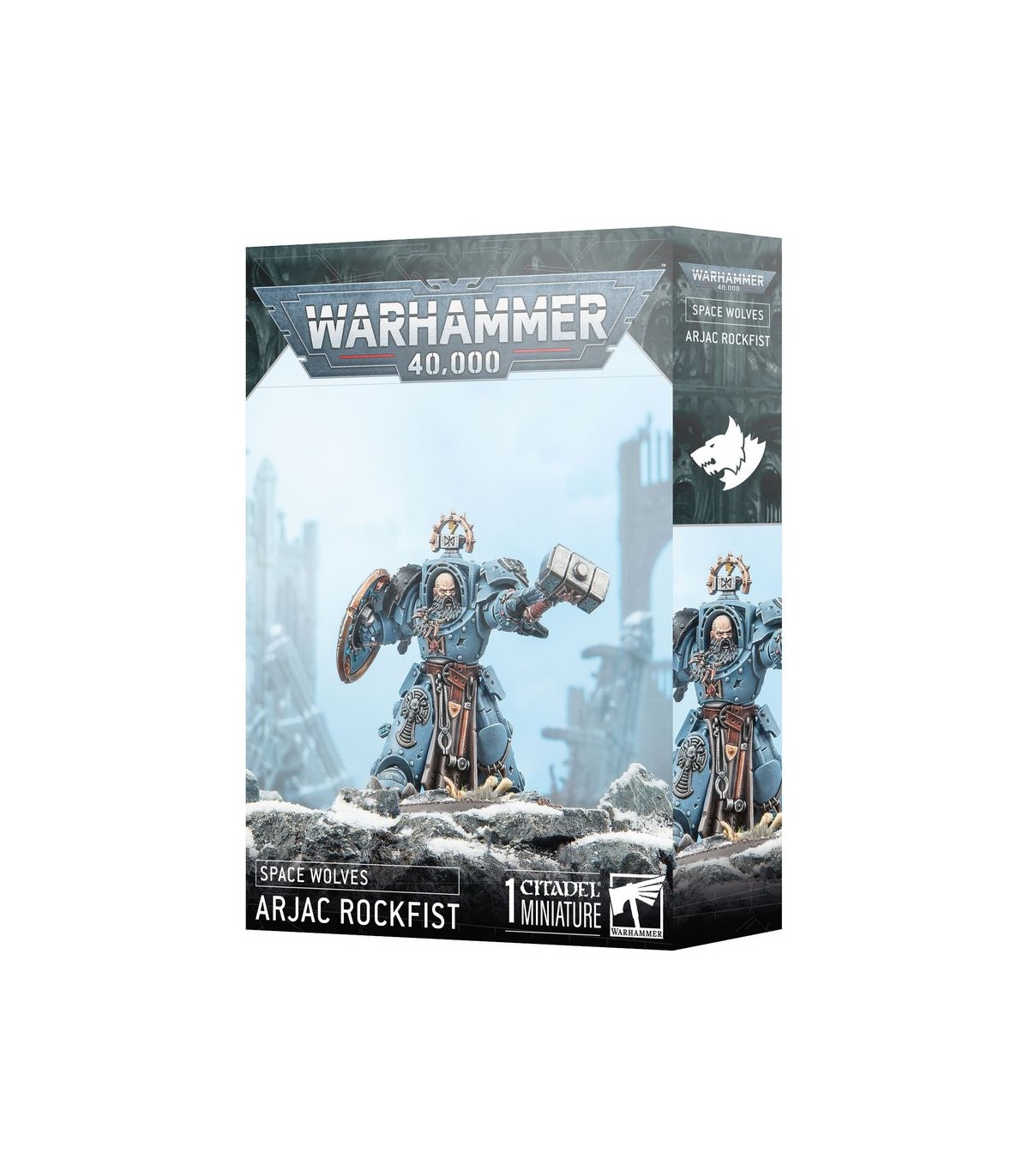 Arjac Rockfist is a towering mass of muscle and a taciturn anvil of endurance. Wielding the enormous Foehammer, he crushes his foes with pulverising strength. As the personal champion of the Great Wolf, Arjac upholds the honour of the Chapter.